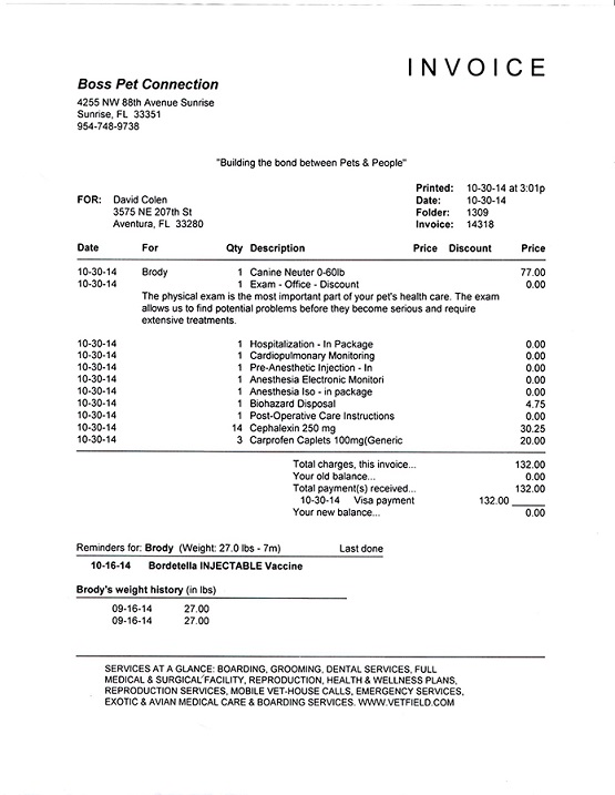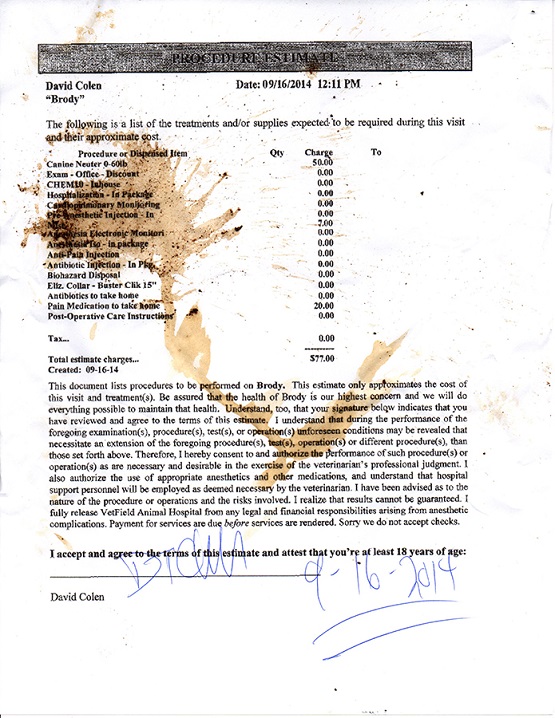 Here's the printed estimate my friend David Cohen received after he went to the Vetfield Animal Hospital and Mobile Vet in Sunrise Florida to meet