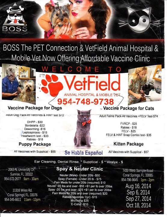 Be extremely careful if you receive this flyer, or one that looks like it, from Vetfield Animal Hospital in Sunrise, Florida, or from Dr. Mustafa Saleh, his son,
